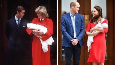 Херцогинята на Кембридж излезе от болницата на ръце с новородения принц и в яркочервена рокля с бяла якичка